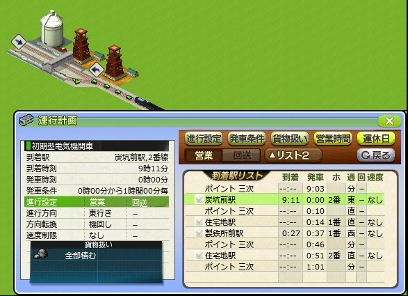 炭坑前駅の1番線には貨物列車が来ないため、夜間はここに待機するよう設定します。