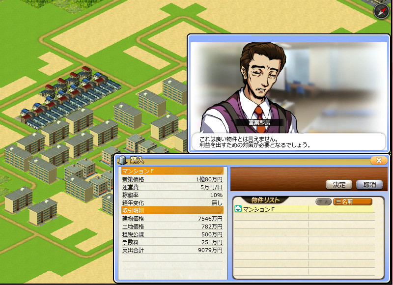 クリア条件は9年以内に「人口5万人」「年間売上高1000億円」「総資産1000億円」。