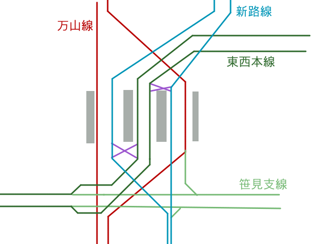 当初は路線別に複線を並べる方法を考えていたのですが、